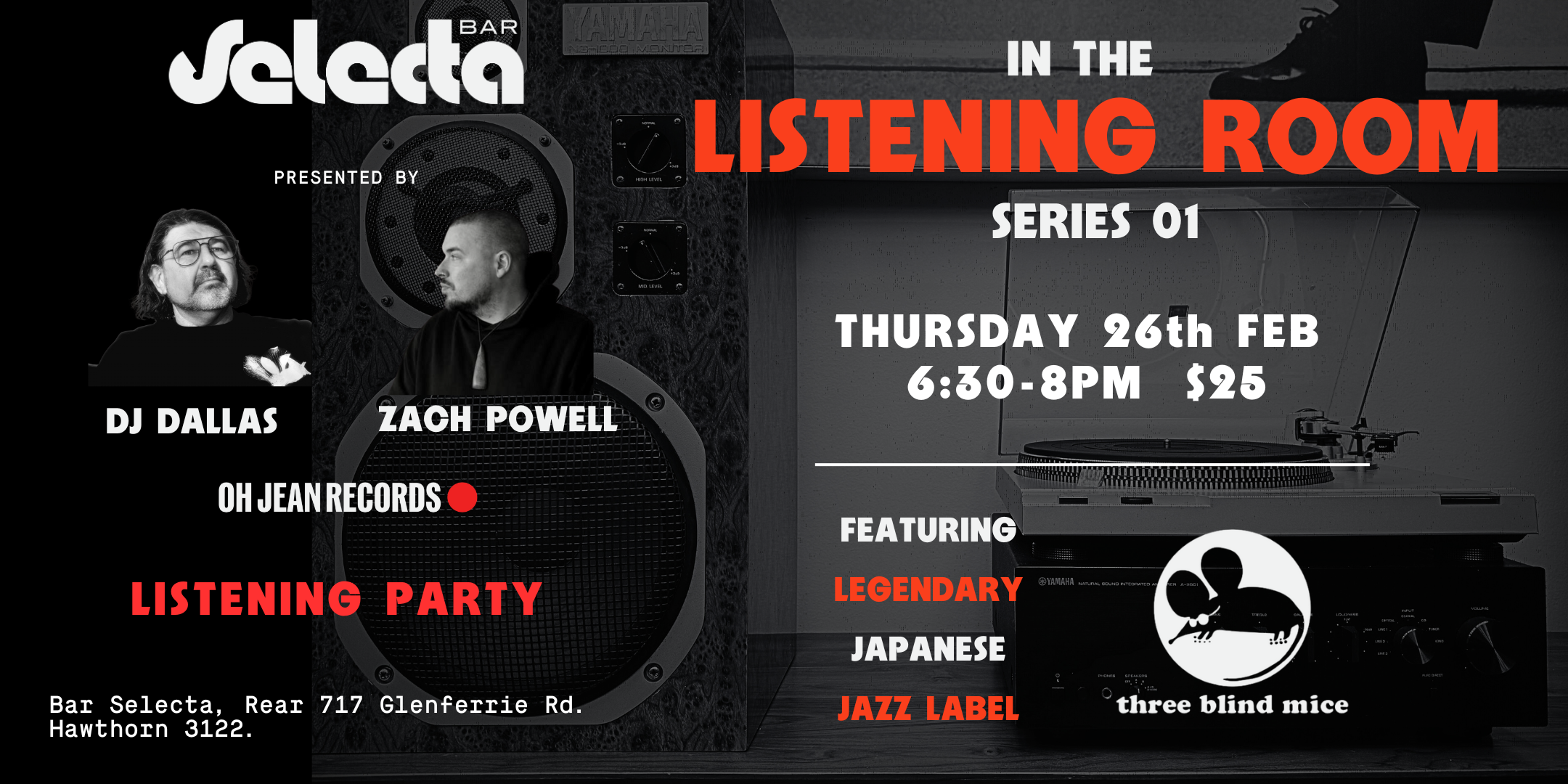 An intentional vinyl listening night dedicated to the legendary Japanese jazz label Three Blind Mice. Hosted by DJ Dallas and Zach Powell (Oh! Jean Records), this focused session invites guests to slow down and listen deeply—sound, space, and story first.
